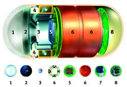Jedan od sastavnih delova endoskopske video-kapsule je baterija, njen energetski izvor koji joj omogućava da tokom jednog pregleda napravi više od 55.000 snimaka. Kapsula dva puta u sekundi snima "na slepo", prethodno osvetlivši taj deo creva. Putem antenskog odašiljača koji je, takođe, sastavni deo kapsule, snimci se šalju u sistem senzora postavljen na kožu prednjeg zida trbuha i prednjeg zida grudnog koša pacijenta. Senzori koji su prikačeni na pacijentove grudi i trbuh prikupljaju te snimke i žičanim putem ih transportuju do data rikordera. Data rikorder je uređaj koji se zakači s desne strane pacijentovog trbuha, tako da ceo taj sistem donekle liči na holter pritiska.