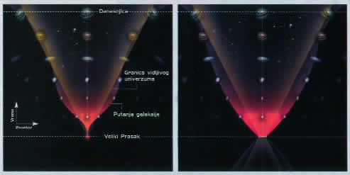 U našem univerzumu, koji se širi, galaksije se žurno udaljavaju jedna od druge. Bilo koje dve galaksije udaljavaju se brzinom koja je proporcionalna udaljenosti među njima: dve galaksije međusobno udaljene 500 miliona svetlosnih godina udaljavaju se dvaputa brže od onih međusobno udaljenih 250 miliona svetlosnih godina. Otuda je i nastala teorija da su sve galaksije verovatno "krenule" sa istog mesta u isto vreme - u trenutku velikog praska. Taj zaključak i dalje važi iako je širenje kosmosa prolazilo kroz periode ubrzanja i usporenja. Dijagram kosmosa (na slici) pokazuje kako galaksije slede sinusnu putanju koja ih uvodi i izvodi iz oblasti svemira koje se mogu posmatrati (žuti klin). Ta situacija, međutim, postaje neizvesna upravo kad galaksije (ili njihovi preci) počnu svoje spoljašnje kretanje.