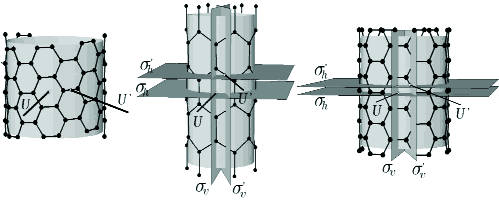 Tri vrste nanotuba, kiralne, cik-cak i sedlaste, sa naglasenim simetrijskim elementima. |