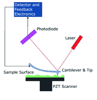 Slika 3. Šematski prikaz AFM (atomic force microscope) spektroskopije. Mikroskopija na bazi atomskih sila sastoji se od konzole na koloj se nalazi oštar vrh (tip). Ovaj vrh se dovede do površine uzorka onoliko blizu dok Van der Valsove sile ne prouzvedu izgib konzole. S druge strane, laserski snop je usmeren na vrh tipa, a reflektovani snop na mrežu (polje) fotodioda. Kada dođe do izgiba konzole, laserski snop reflektovan od tip-a se pomera i pobuđuje različite fotodiode na detektoru. Na ovaj način se dolazi do vizuelizacije oblika površine uzorka. AFM spektroskopija ne zahteva posebne uslove (vakuum ili posebnu pripremu uzoraka) pa se može korisititi i za biološke sisteme. Glavni nedostatak ove tehnike je relativno malo polje merenja površine uzorka (150x150 mikrometara), dok u slučaju STM ono je reda nekoliko milimetara. |