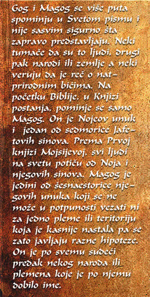 Narodi su, prema biblijskom tumačenju, nazivani po svojim precima. Prvo zajedničko pominjanje ova dva entiteta je u biblijskoj Knjizi proroka Jezekilja. Iz teksta se može zaključiti da je Gog vladar Magoga i zemalja Meseha i Tuvala. Postoje i drugačija tumačenja. Gog je okupio veliku vojsku i, zajedno sa brojnim saveznicima, krenuo da uništi Izrailj odnosno Svetu zemlju. Krenuće u pljačkaški pohod na slabo utvrđena naselja.U Svetom pismu piše i da je Gogova zemlja bila severno od Izraela ali se to ne potkrepljuje podacima.