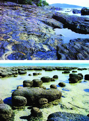 Gore: Fosilni stromatoliti od pre oko 2,2 – 2,0 milijarde godina iz Guntflint Iron Fm., oko jezera Superior u Kanadi;