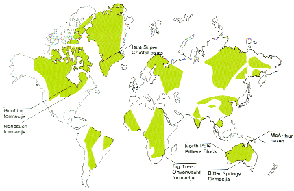Prikaz današnjeg geografskog položaja prekambrijumskih tvorevina sa fosilnim nalascima (obojeno). Mnoge su daleko od svog prvobitnog položaja, jer ih je kretanje kontinenata značajno razmaknulo. |