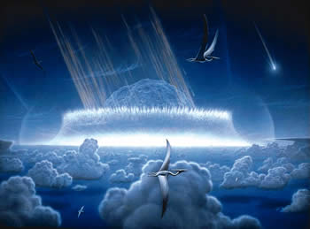 Šta bi se desilo da asteroid prečnika 10 km udari u Zemlju, kao što je to bilo pre 65 miliona godina? Takav udar oslobodio bi energiju ravnu eksploziji oko pedeset miliona megatona. Bio bi stvoren krater prečnika 100 do 200 km, dubine 30 do 40 km, a u gornje slojeve atmosfere bi bila izbačena tolika količina materijala da bi, u toku dva do tri meseca, cela planeta utonula u noć. Ozonski omotač bi takođe mogao da nestane, a stvaranje otrovnih oksida azota u atmosferi dovelo bi do nagrizajućih kiselih kiša.