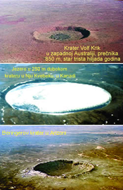 Da su nekada padali asteroidi i veliki meteoriti, svedoče na primer i Beringerov krater u Arizoni, prečnika 1240 m i dubine 170 m, koga još zovu i “Đavolov kanjon”. Nađeno je i desetak kratera prečnika većeg od 100 km. Na rubu jednog od njih podignuta je Asuanska brana u Egiptu.