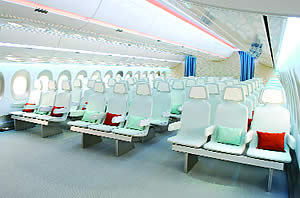 Dodatni komfor u putničkoj kabini obezbeđuje dizajn aviona koji ima proširen trup gotovo konstantnog prečnika od 5,36 m, što omogućava širinu sedišta od gotovo 5 cm. Prostrana kabina, u kombinaciji sa odličnim LED osvetljenjem i povećanim prozorima, pruža dodatni osećaj udobnosti. Samo osvetljenje putničke kabine pomoću LED dioda omogućava praktično bezbroj mogućnosti i dozvoljava svakoj avio-kompaniji da poseduje jedinstven sistem povoljnosti u svojim avionima, kao i da kombinacijom dnevnog i noćnog osvetljenja putnici lakše podnesu prekookeanske letove. Predviđeno je da osvetljenje stvara i posebne efekte kako bi se dodatno poboljšao osećaj udobnosti na letu.