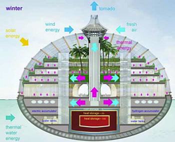 Reč je o građevini lučnog oblika, u vidu školjke. Predviđa se da Arka pluta po površine vode i da bude samoodrživa - dovoljna za opstanak ljudi i životinjskog i biljnog sveta. Zatvoreni životni ciklus, u kojem je u prvom planu priroda, primenjen je i u ovom slučaju. U energetskom pogledu, sve će finkcionisati tako što će se energija Sunca, tokom toplih letnjih dana, apsorbovati preko velikih staklenih površina, ulaziće u zgradu i akumulirati se u vidu toplog vazduha, tople vode i električne energije. U vreme hladnih zima, energija će se koristiti i za druge potrebe stanovnika: grejanje, proizvodnju hrane, osvetljenje...