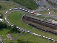 Kroz tunel se odvija železnički saobraćaj kroz dve „cevi“. Zbog razloga sigurnosti postoji i treća „cev“. Od Folkstouna (Engleska) do Kalea (Francuska) putovanje traje nešto više od pola sata.