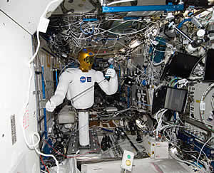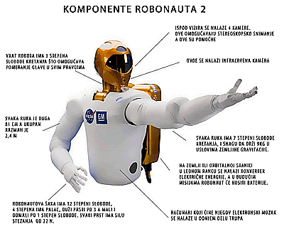 Robonaut je pravo čudo tehnike, a njegovi pokreti ruku, šaka i pojedinačnih prstiju gotovo da ne zaostaju za ljudskim. Njegova masa je oko 150 kg, visina od pojasa do vrha glave 1 m, svaka ruka je duga 81 cm a ukupan razmah je 240cm. Napravljen je od čelika i aluminijuma a baterije nosi na leđima. U glavi ima dve primarne i dve rezervne steroskopske kamere i dopunsku IC kameru. Za sada se ispituje unutar orbitalne stanice i uči osnovne radnje kao što su uključenje i isključenje prekidača itd. Postavljen je na nepokretnu osnovu. Nije spreman za izlazak u bezvazdušni prostor jer i njemu treba zaštitni skafander zbog velikih temperaturnih razlika dnevne i noćne strane i uticaja zračenja. Kada bude osposobljen za rad u vakuumu, komande će mu se prenositi preko senzorske rukavice a operater će 3D sliku primati iz robonautovih stereokamera.