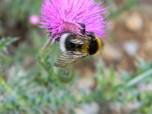 Ja sam se umorio, hajde da borbu zasladimo bumbarovim medom. Da, da, dobro si čula, bumbarovim medom. Mnogi ne znaju da bumbari skupljaju med. Jeste da su to male količine ali su med, najbolji med koji možeš probati. Bumbarova gnezda su na zemlji, u mahovini. Bumbari su divni, dobroćudni, neotrovni i izuzetno korisni insekti. Nije uzalud veliki kompozitor Rimski-Korsakov komponovao prekrasnu kompoziciju Bumbarov let . Hajde da uz tu muziku otpratimo ovog debelog kako vredno skuplja nektar i u isto vreme oprašuje cvet. |