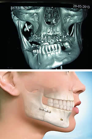1.Pacijent sa ankilozom viličnog zgloba kao posledica porođajne traume zbog primene tzv. forceps klešta u toku izvlačenja bebe. Centar rasta donje vilice oštećen je kleštima, zglob je srastao u koštanu masu a donja vilica se nije razvijala.