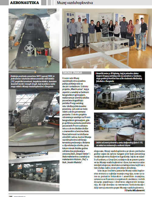 U svom radu Muzej vazduhoplovstva posebnu pažnju poklanja radu sa decom i omladinom. U okviru projekta „Mladi kustosi“, koji je započet u saradnji sa Sedmom beogradskom gimnazijom, realizovana je učenička izložba posvećena stogodišnjici početka Prvog svetskog rata. Izložba je bila izuzetno posećena, i još uvek se može videti u okviru privremene postavke. U okviru projekta ostvarena je saradnja i sa Prvom beogradskom gimnazijom, gde je upriličena postavka predmeta posvećenih Prvom svetskom ratu a u okviru školske izložbe o znamenitim učenicima škole. Pored aktivnosti na izložbama učeničkih radova, kustosi Muzeja vazduhoplovstva održavaju tematska predavanja u školama u cilju edukacije učenika, pa su tokom minule školske godine održana dva predavanja u osnovnoj školi „Despot Stefan“ i škola maketarstva u saradnji sa maketarskim klubom „Oluj“ u školi „Veselin Masleša“. |