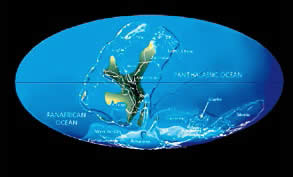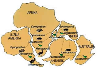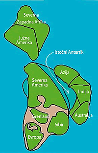 | Sl. 8. Superkontinent Pangea tokom kasnog paleozoika (pre oko 260 miliona godina) sastavljen je od dva velika dela (Gondvana na jugu i na Laurazi j a na severu). |