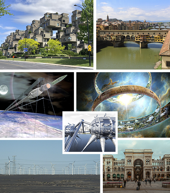 vertikalnih šahtova i spiralnih stepenica, kanala koji podsećaju na cevi za donos i odvod vode,