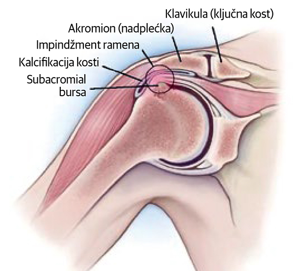 Impindžment je biomehanički poremećaj pri kome dolazi do nefiziološkog kontakta, mehaničkog sudaranja glave nadlakatne kosti i vrha ramena (acromion), i bolnog pritiskanja mekih tkiva između tih kostiju, rotatornih mišića i rotatorne manžetne. Pored stalnog bola (sindrom bolnog ramena), posledice su i upale, stvaranje kalcifikata i rupture (pucanje) mekih tkiva. Američki stručnjaci su, prema rečima dr Medenice, u svojim istraživanjima našli da kod osoba starijih od 60 godina više od 50 odsto njih sa impindžmentom ima potpuni raskid rotatornih mišića; sa godinama, mišići gube na svojoj elastičnosti, postaju fibrozni i kruti, i budući da su predmet stalnog impindžmenta, pucaju i pri najmanjoj traumi. Problem impindžmenta u zglobu ramena, koji nastaje usled povrede i/ili degenerativnih bolesti, može da se reši isključivo hirurškim (artroskopskim) putem.