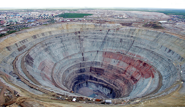 Rudnik “Mir” je jedna od najvećih rupa iskopanih ljudskom rukom na površini Zemlje. Sa svojih 525 m dubine i 1200 m širine, nalazi se u Sibiru, u oblasti Saha, na istoku Rusije. Rezerve dijamanata na tom mestu otkrivene su 1955. godine, kada je jedna geološka ekspedicija pronašla uzorke vulkanske stene kimberlit, koja je najčešće vezana za dragulje. Dve godine kasnije, počelo je vađenje rude, iako su uslovi za to bili teško zbog smrznutog tla čak 7 meseci tokom godine, a tokom kratkog leta - zbog dubokog blata.