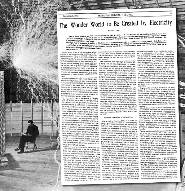 Upravo pod ovim naslovom, Tesla je 9. septembra 1915. Godine, u časopisu Manufacturer,s Record,
