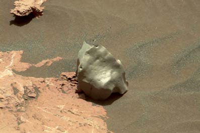 Terensko istraživačko vozilo curiosity (radoznalost) koje je NASA spustila na površinu Marsa 2012. možda je uspelo da otkrije svoj treći meteorit na Marsu. Ova fotografija, snimljena 12. januara dok je curiosity obavljala istraživanja na planinskom vrhu poznatom kao Mount Sharp, čini se da prikazuje meteorit sačinjen od gvožđa i nikla, jedan od svega nekoliko sličnih zapaženih na Crvenoj planeti. Izgleda da se curiosity dosta približila neobičnoj steni. Tri male, sjajne tačke u blizini središnjeg dela stene su verovatno rupice koje je napravio chemCam laser na bazi spektrometra koji curiosity koristi za procenu sastava stena.