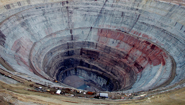 Rudnik “Mir” je jedna od najvećih rupa iskopanih ljudskom rukom na površini Zemlje. Sa svojih 525 m dubine i 1200 m širine, nalazi se u Sibiru, u oblasti Saha, na istoku Rusije. Rezerve dijamanata na tom mestu otkrivene su 1955. godine, kada je geološka ekspedicija predvođena Jurijem Kabardinom, Jekaterinom Elaginom i Viktorom Advenkom, pronašla uzorke vulkanske stene kimberlit, koja je najčešće vezana za dragulje. Dve godine kasnije, počelo je vađenje rude, iako su uslovi za to bili teško zbog smrznutog tla čak 7 meseci tokom godine, a tokom kratkog leta - zbog dubokog blata.