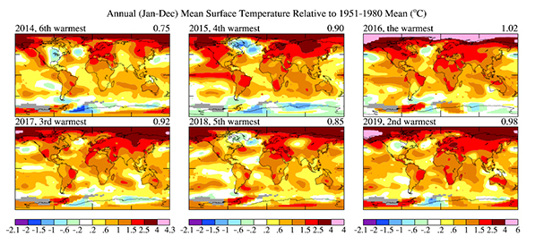 Ne samo vreme, i klima, ta pomenuta sveukupnost vremenskih stanja, u zavisnоsti od doba godine i mesta na Zemlji, se menja. Bila je već reč o ledenim dobima. Velika većina naučnika koji se bave praćenjem klime, smatraju da je danas, naprotiv, u toku globalno zagrevanje. Svake od poslednjih šest godina, 2014. do 2019, srednja temperatura na Zemlji pri tlu bila je veća nego u bilo kojoj godini pre toga od kako postoje meteorološka merenja, poslednjih oko 150 godina (slika).